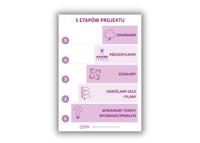 - 5 etapów projektu – pokazuje etapy projektów w formie kolejnych stopni wtajemniczenia! Do pokazania, wydrukowania, naklejania i modyfikowania według waszych potrzeb!