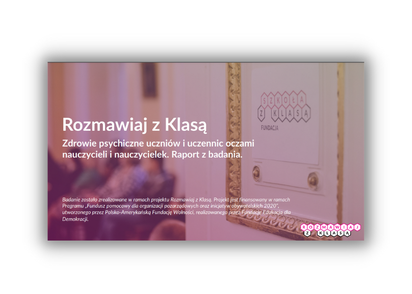 Raport Rozmawiaj z klasą. Zdrowie psychiczne uczniów i uczennic oczami nauczycieli i nauczycielek jest diagnozą dzisiejszej szkoły widzianą oczami nauczycieli i nauczycielek. Zachęca do refleksji o tym, że szkoła może być miejscem, w którym wszyscy czują się na tyle dobrze, że nie boją się mówić o swoich lękach, obawach i problemach, bo wiedzą, że otrzymają zrozumienie i wsparcie. I że warto taką szkołę tworzyć.