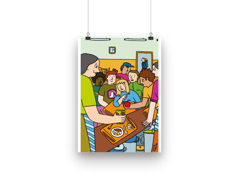 Wielkoformatowe kolorowanki pocięte na mniejsze elementy (składane do A3) – Stołówka autorstwa Marty Zabłockiej / życie-na-kreskę. Materiał dołączony do paczki Razem w Klasie. Propozycje aktywności ułatwiających komunikację w grupie, nawet bez słów dostępne w segregatorze “Razem w Klasie 2”.