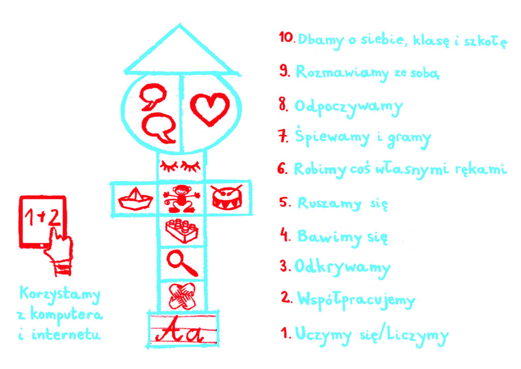Program promuje model uczenia według 10 kluczowych pól aktywności uczniów i uczennic. Siłą modelu jest jego prostota i wyrazistość, z jaką powtarza wymagania ogólne podstawy programowej dla klasy I. W Nauczycielu/ce I klasa nacisk kładziemy na metody nauczania (a nie treści) i zrozumiałe opisanie różnych aktywności dzieci. Stworzyliśmy model edukacji pierwsza klasa, który obejmuje 10 pól aktywności (pola zobrazowane na zdjęciu zamieszczonym powyżej)