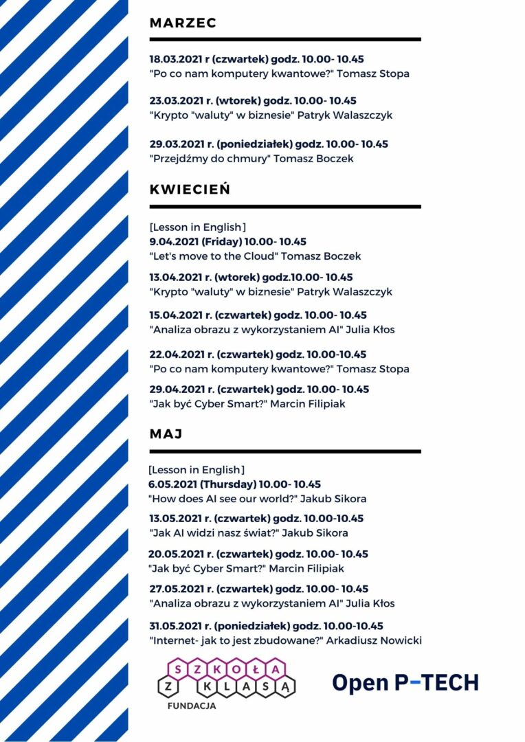 • na spotkania mogą zapisać się jedynie osoby, które posiadają konto na platformie Open P-Tech (informacja o tym jak zarejestrować się na platformie znajduje się tu: https://uzhin.org/kompetencje-zawodowe-jutra-w-zasiegu-twojej-reki-zapraszamy-na-nowa-platforme-open-p-tech/),