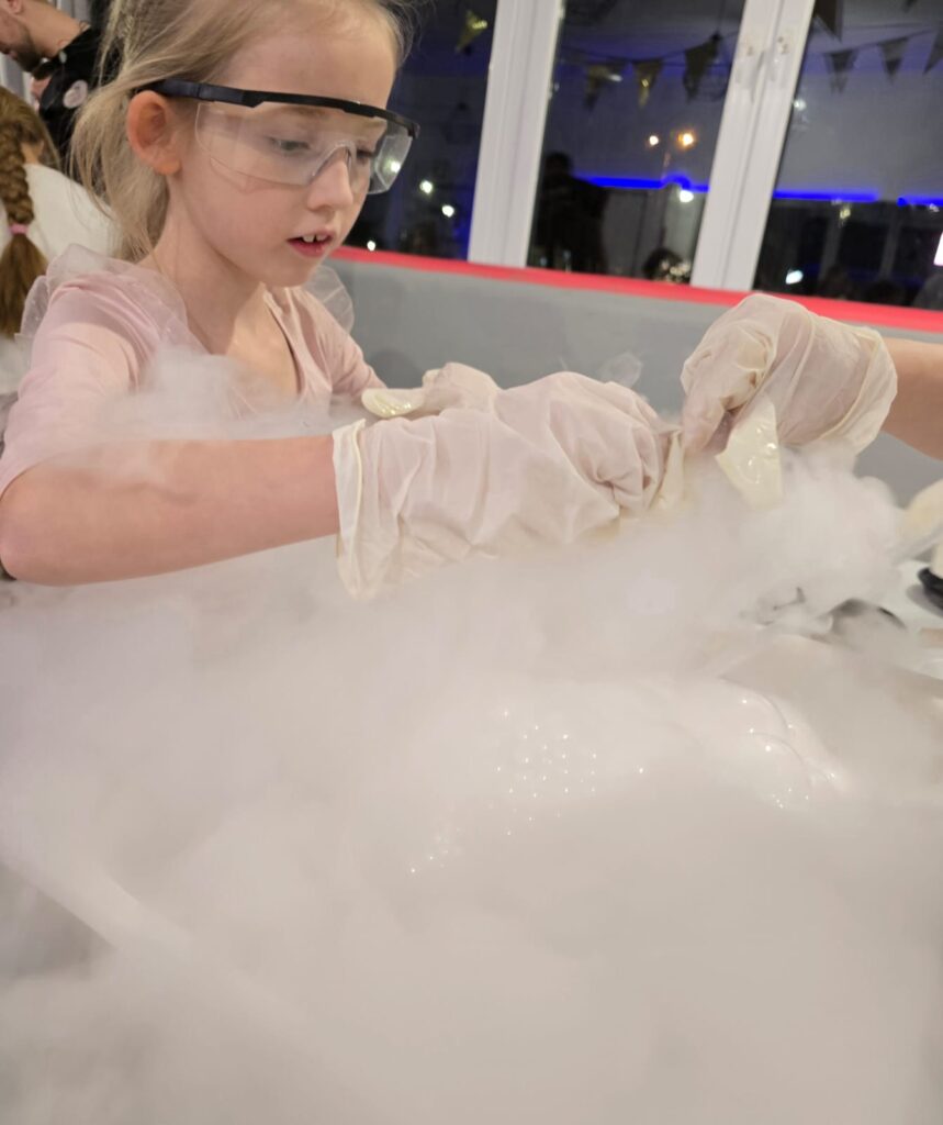 Dzieci poznają fascynujący świat nauki, obserwując bezpieczne i efektowne eksperymenty z suchym lodem. To wesoła, pełna magii zabawa, która rozwija ciekawość i wyobraźnię. ❄🧪