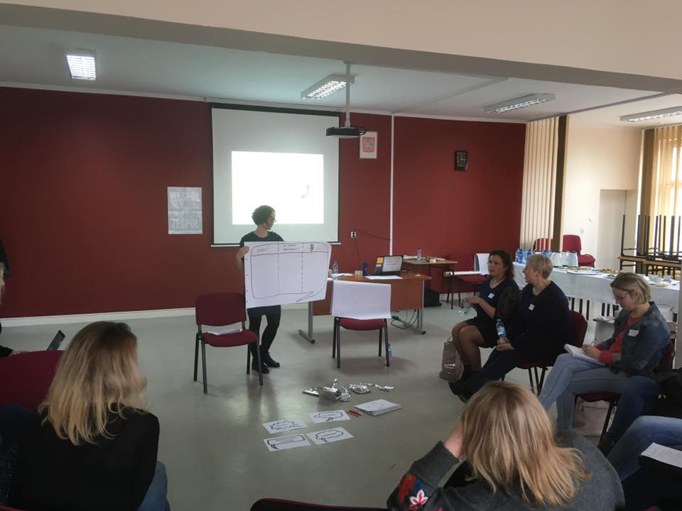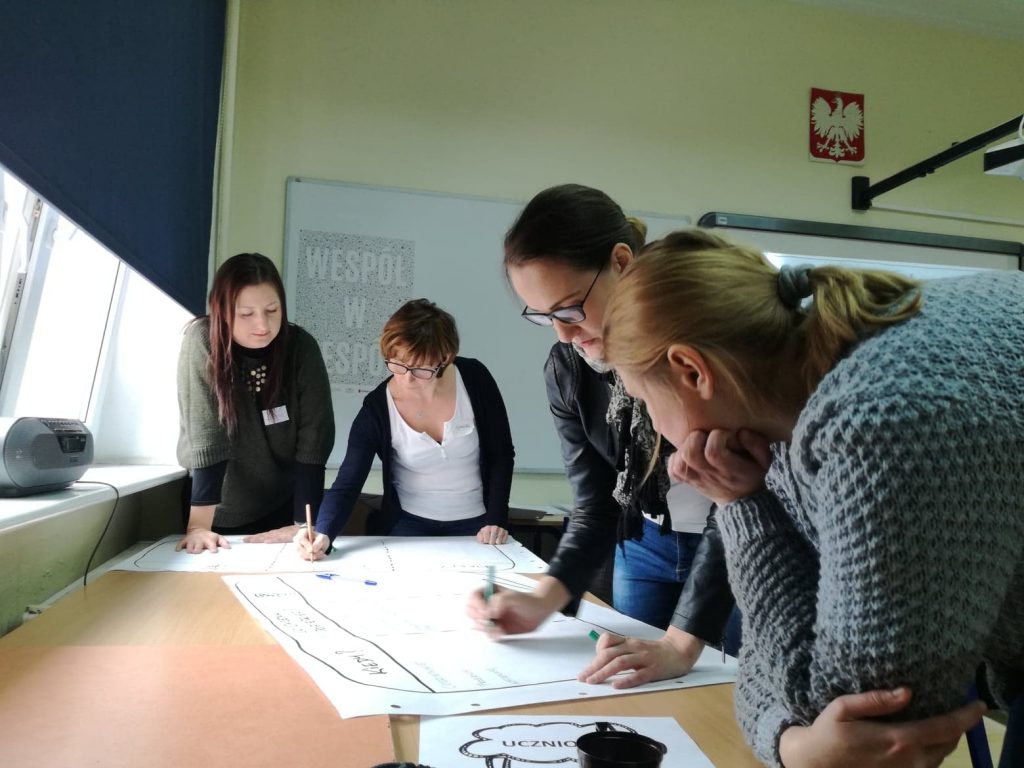 Najpierw określiliśmy grupy, z którymi się komunikujecie. Od najbardziej oczywistych, jak uczniowie, inni nauczyciele i pracownicy szkoły, przez rodziców i szeroko rozumianą społeczność lokalną (organ prowadzący, kuratorium, sponsor, instytucja kultury, ale też osiedle, inna szkoła, koło gospodyń wiejskich, czy nawet pobliski sklep). Kolejnym krokiem było określenie tego, w jakich sytuacjach nauczyciele komunikują się z poszczególnymi grupami, jakie informacje są wtedy przekazywane i czego ewentualnie w tej komunikacji brakuje. Praca w grupach nad tymi zagadnieniami, a następnie omówienie na forum jej wyników, były wstępem do ciekawych rozmów. Najważniejszy wniosek ze wszystkich szkoleń lokalnych jest jeden – nauczyciel, poza podstawowymi obowiązkami, musi pełnić również rolę sprawnego menedżera do spraw komunikacji.