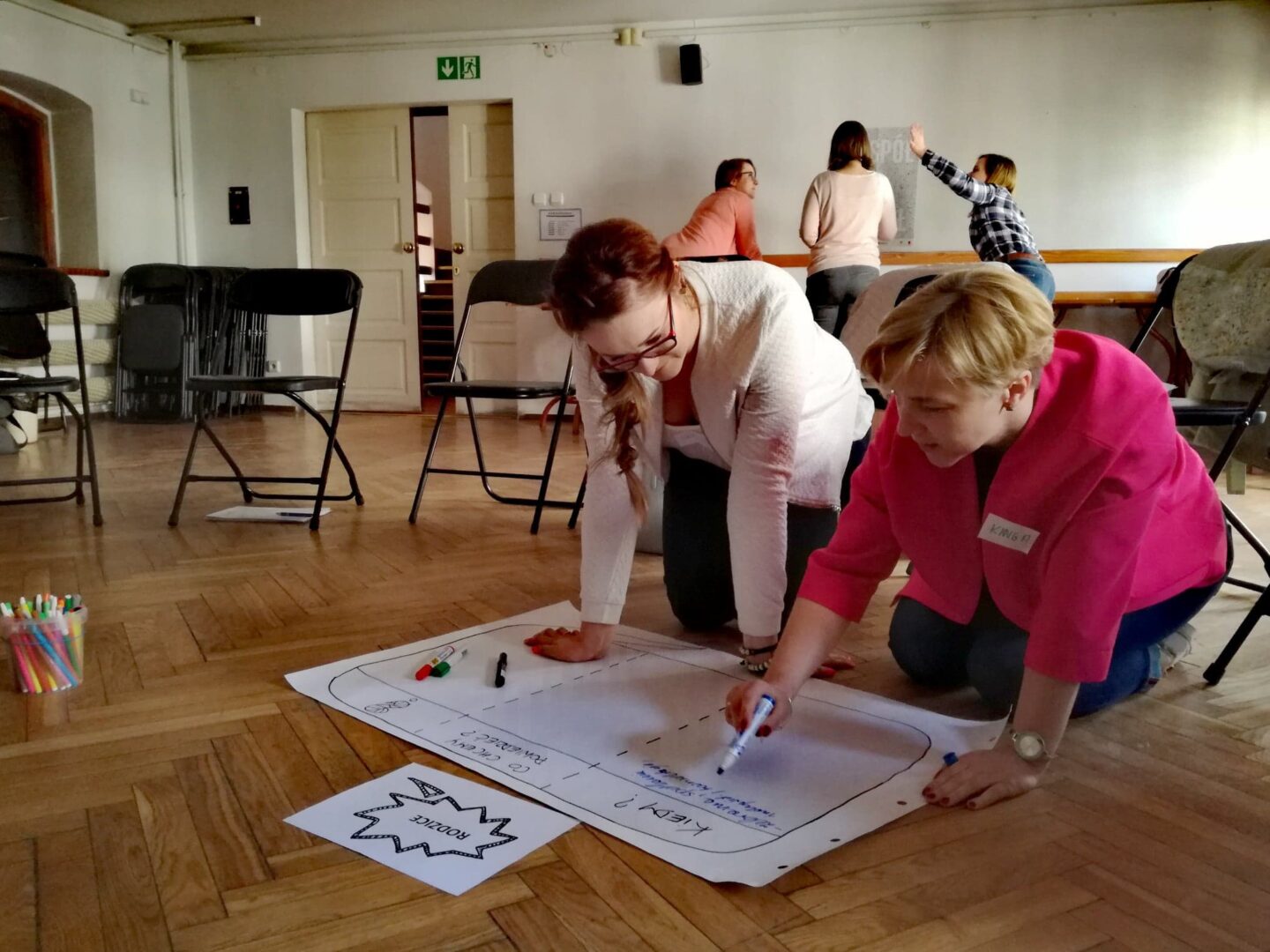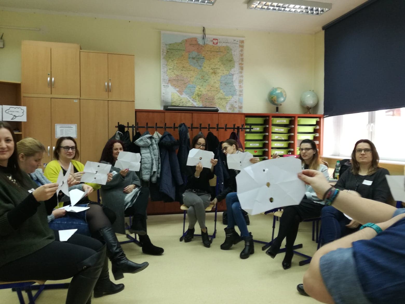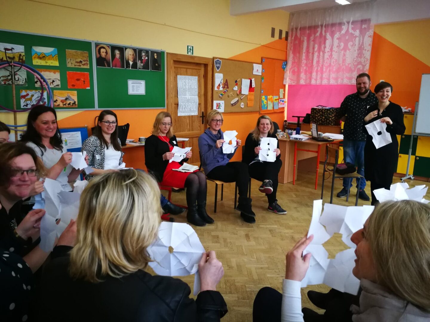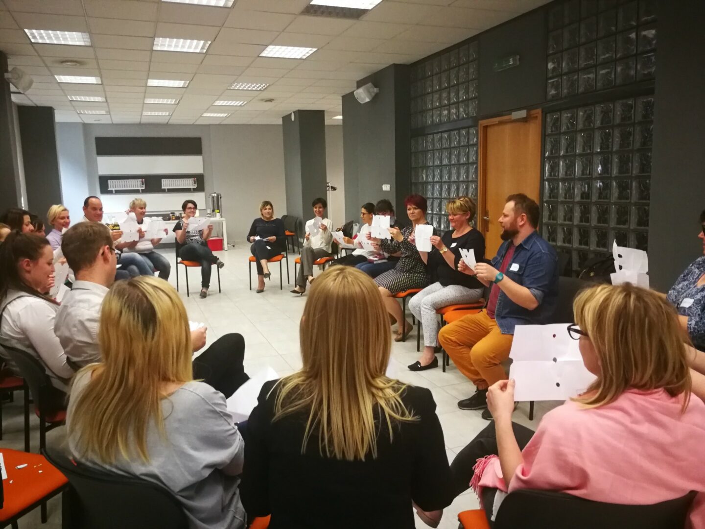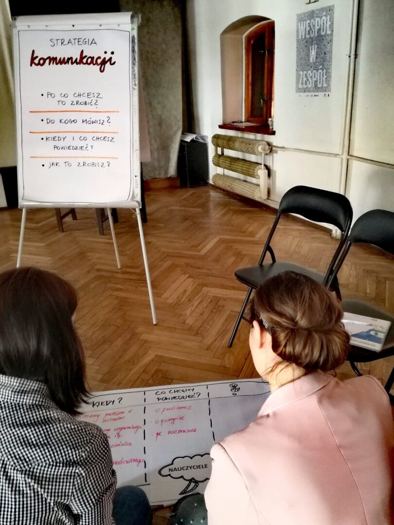 Jak to zazwyczaj na naszych szkoleniach bywa, staraliśmy się, żeby część teoretyczna, chociaż niezbędna, nie była zbyt długa. Mimo, że każdy z nas komunikuje się codziennie, to postawiliśmy na uporządkowanie ogólnej wiedzy dotyczącej samego procesu. Niepozorne ćwiczenie z pustą kartką – jej składaniem i wydzieraniem zgodnie z wydawanym komunikatem – stało się pretekstem do omówienia elementów procesu komunikacji. Rozmawialiśmy o nadawcy, odbiorcy, komunikacie i towarzyszących im szumach, o kontekście, przekazach werbalnych i niewerbalnych oraz o komunikacji wewnętrznej i zewnętrznej. To wszystko było punktem wyjścia do rozłożenia szkolnej strategii komunikacji na czynniki pierwsze.