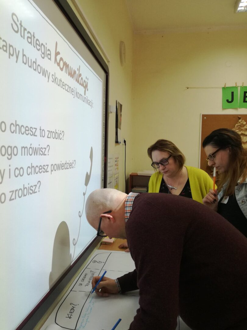 Część warsztatów dotycząca narzędzi zamknęła proces przechodzenia przez strategię komunikacji – podczas szkolenia wspólnie odpowiedzieliśmy na pytania po co się komunikujemy w szkole, do kogo mówimy, kiedy i co chcemy powiedzieć i jak to robimy?