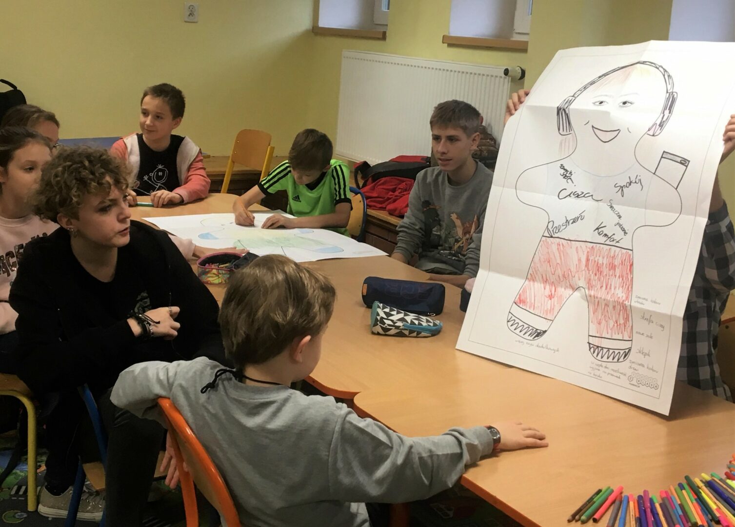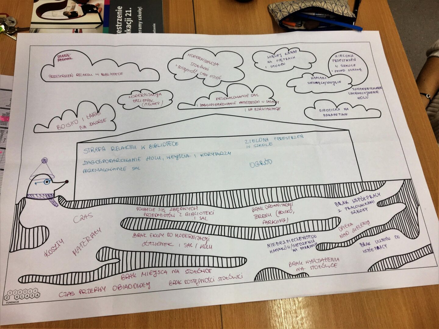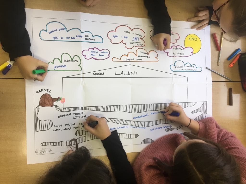 Pomysłów było wiele – większość z nich, ku naszemu zaskoczeniu, naprawdę bardzo realnych! Dzieci i młodzież doskonale zdają sobie sprawę z tego, jak bardzo przestrzeń wpływa na proces uczenia się i nauczania i widzą, które zmiany leżą w ich zasięgu działania.